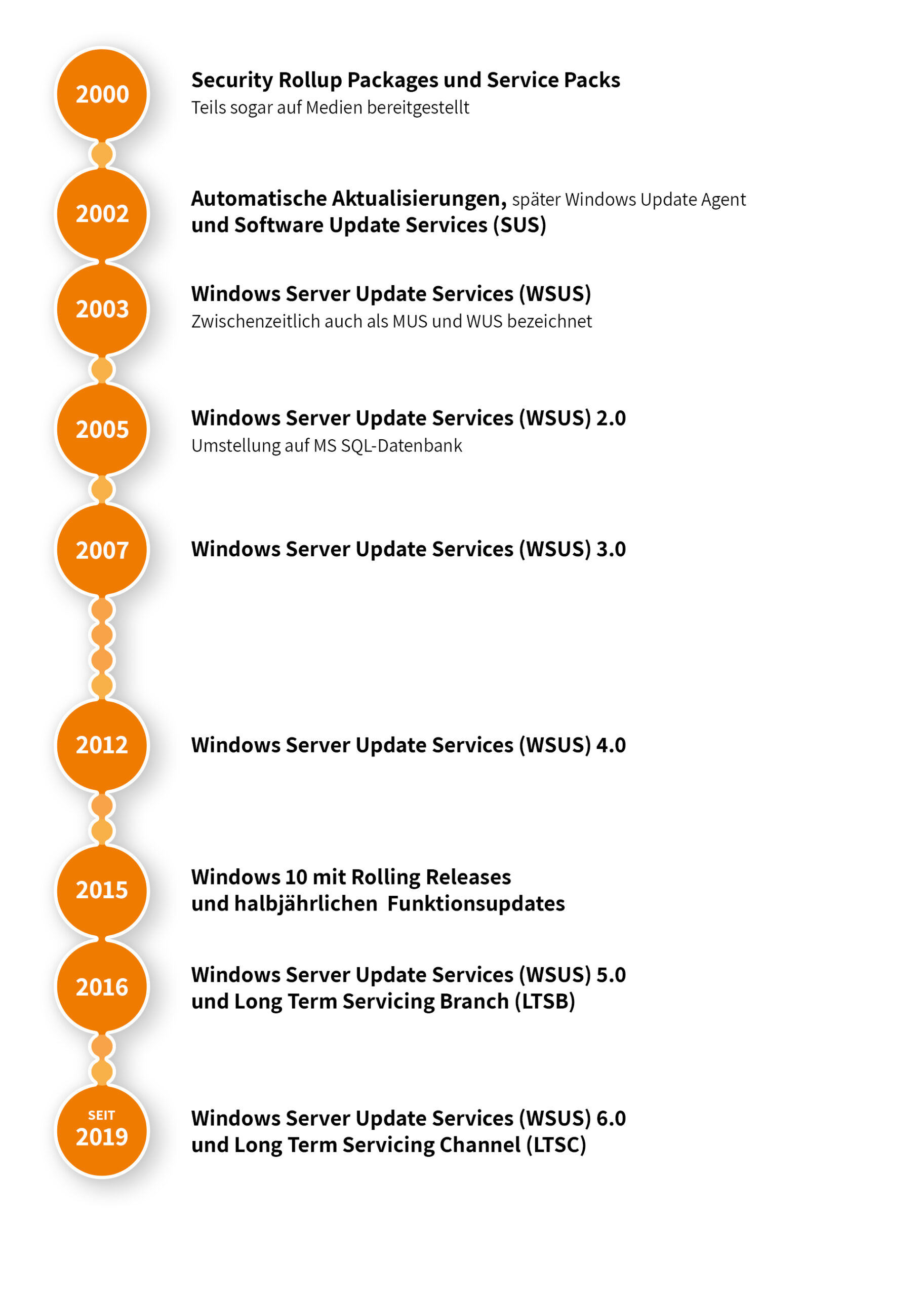 Vor Windows 2000 SP3 wurden Updates von Microsoft in sogenannten Security Rollup Packages und Service Packs organisiert [1]. So wurden in längeren, mehr oder weniger unregelmäßigen Abständen diverse Fehler behoben und neue Funktionen eingeführt, was eher einem umfangreichen Upgrade entsprach als einem dedizierten Patch für ein konkretes Problem. Mangels flächendeckend verfügbarem Breitbandausbau wurden diese teils sogar auf Medien bereitgestellt, z. B. auch über Heft-CDs bekannter Computermagazine. Mit dem Feature der „automatischen Aktualisierungen“ (später Windows Update Agent) stellte Microsoft seit 2002 eine Möglichkeit bereit, einzelne Updates automatisiert im Hintergrund bereitzustellen und installieren zu lassen. Parallel wurden mit dem SUS (Software Update Services) und dem Nachfolger WSUS (Windows Server Update Services – zwischenzeitlich auch MUS und WUS[2]), welcher seit Windows Server 2003 enthalten ist, ein Dienst bereitgestellt, um Updates lokal in der Firma bereitzustellen und freigeben zu können. Seither fiebern viele Administratoren dem zweiten Dienstag im Monat, dem sogenannten „Patch Tuesday“ entgegen, an dem Microsoft neue Updates bereitstellt. Patche, die ungeplant außerhalb des regulären Rhythmus notwendig und kurzfristig veröffentlicht werden, bezeichnet Microsoft aktuell als Out-of-Band-Updates (OOB).