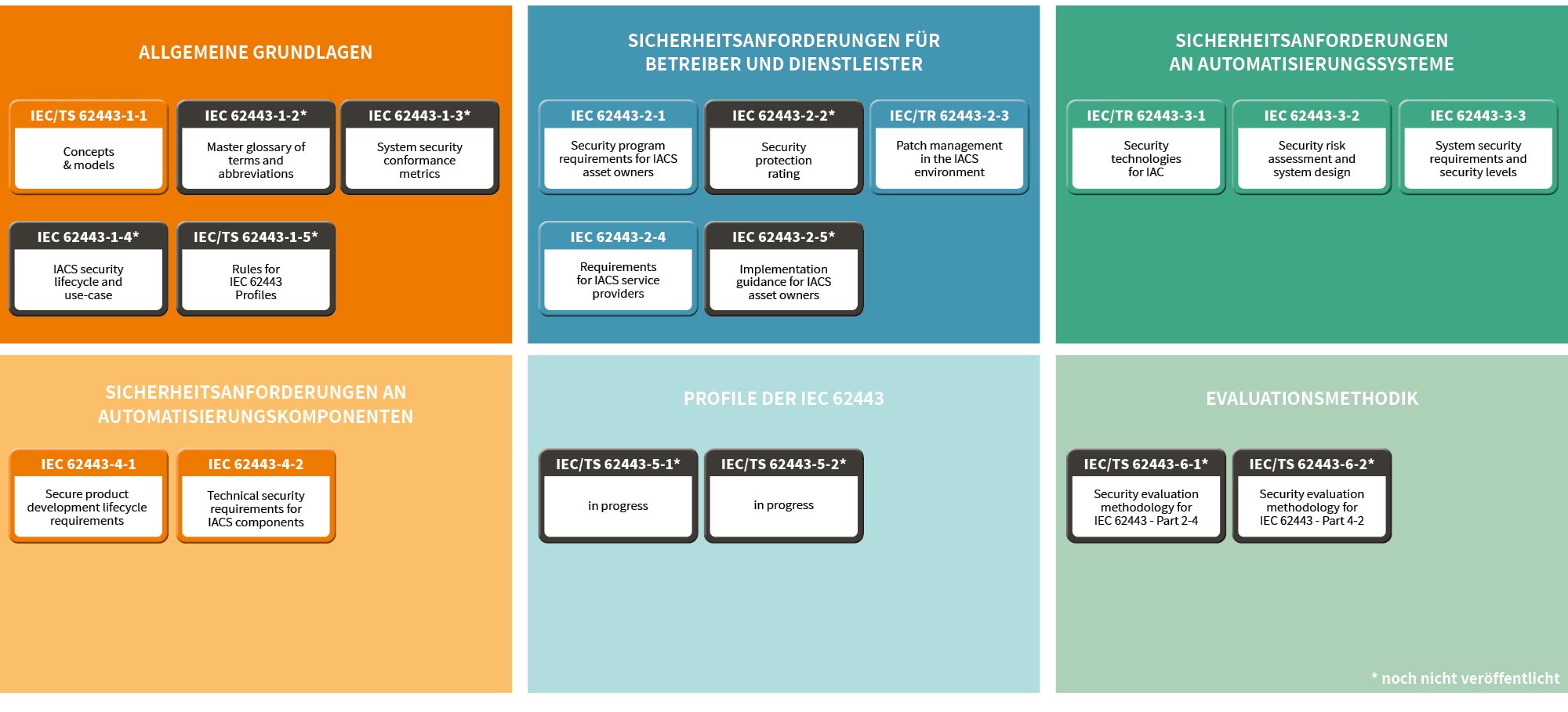 Das Hauptziel der IEC 62443 besteht darin mögliche Schwachstellen in der industriellen Steuerungs- und Kommunikationstechnik zu ermitteln und geeignete Schutzmaßnahmen zu entwickeln. Hier finden Sie den Aufbau der Normenreihe IEC 62443: