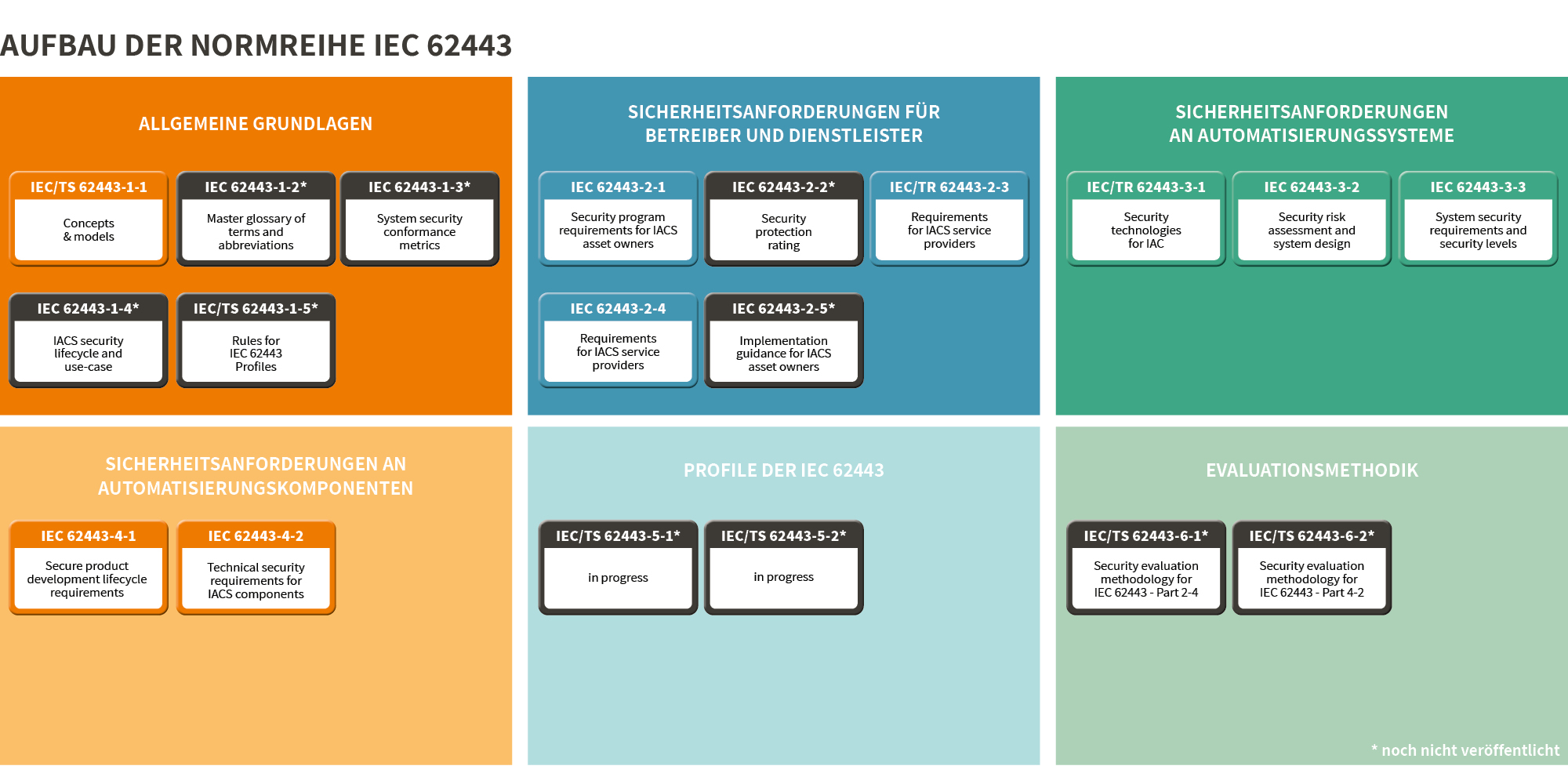 Die Struktur des IEC 62443 ist in folgende Bereiche gegliedert: