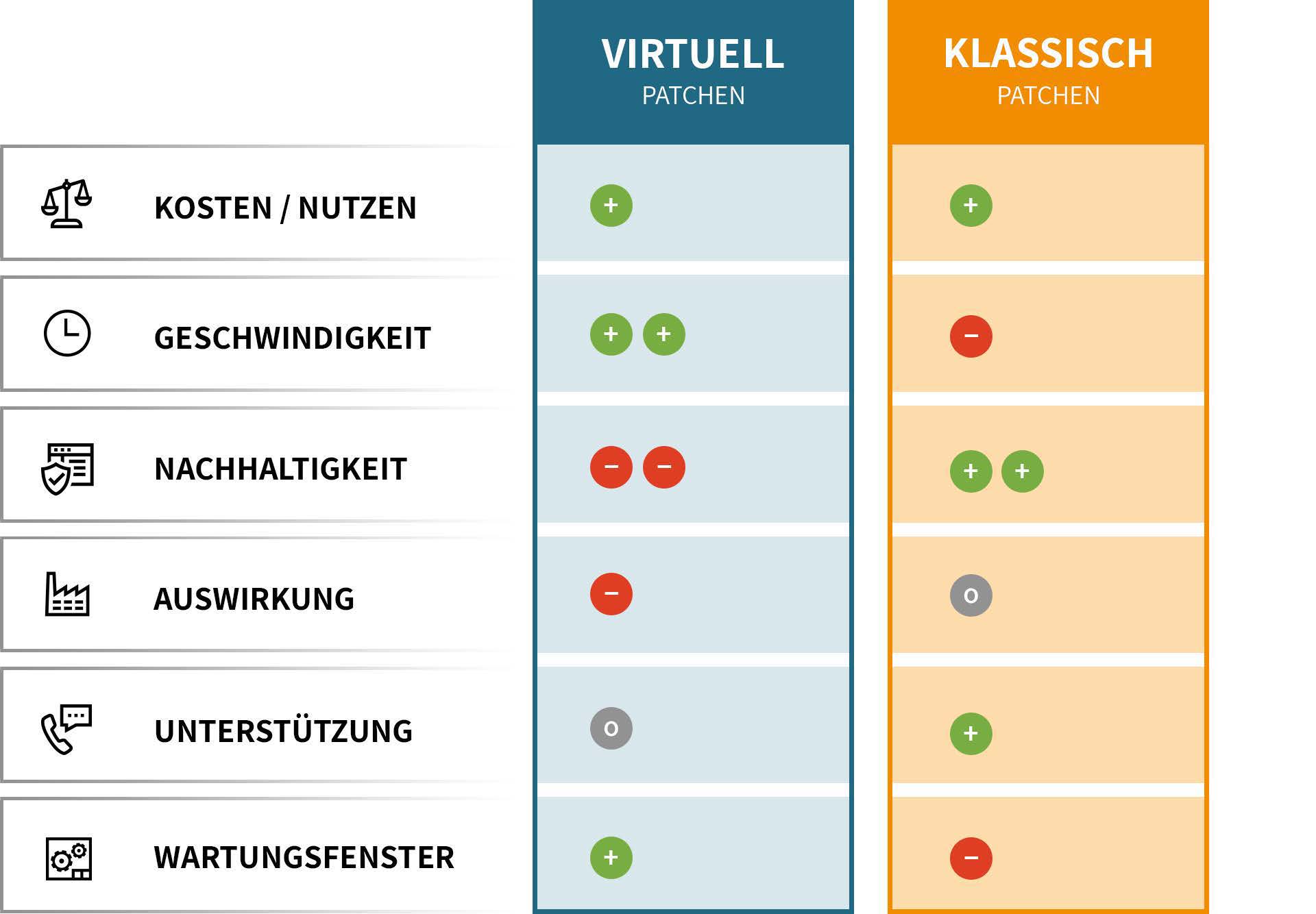 Im konkreten Anwendungsfall bedeutet das für den klassischen Patchen, dass Zeit für die Installation benötigt wird, anschließend SMB aber wieder wie zuvor genutzt werden kann. Beim virtuellen Patchen hingegen kann die Maßnahme sofort ergriffen werden, schränkt jedoch die Kommunikation via SMB ein und hat somit gegebenenfalls negative Auswirkungen auf den Geschäfts- bzw. Produktionsprozess.