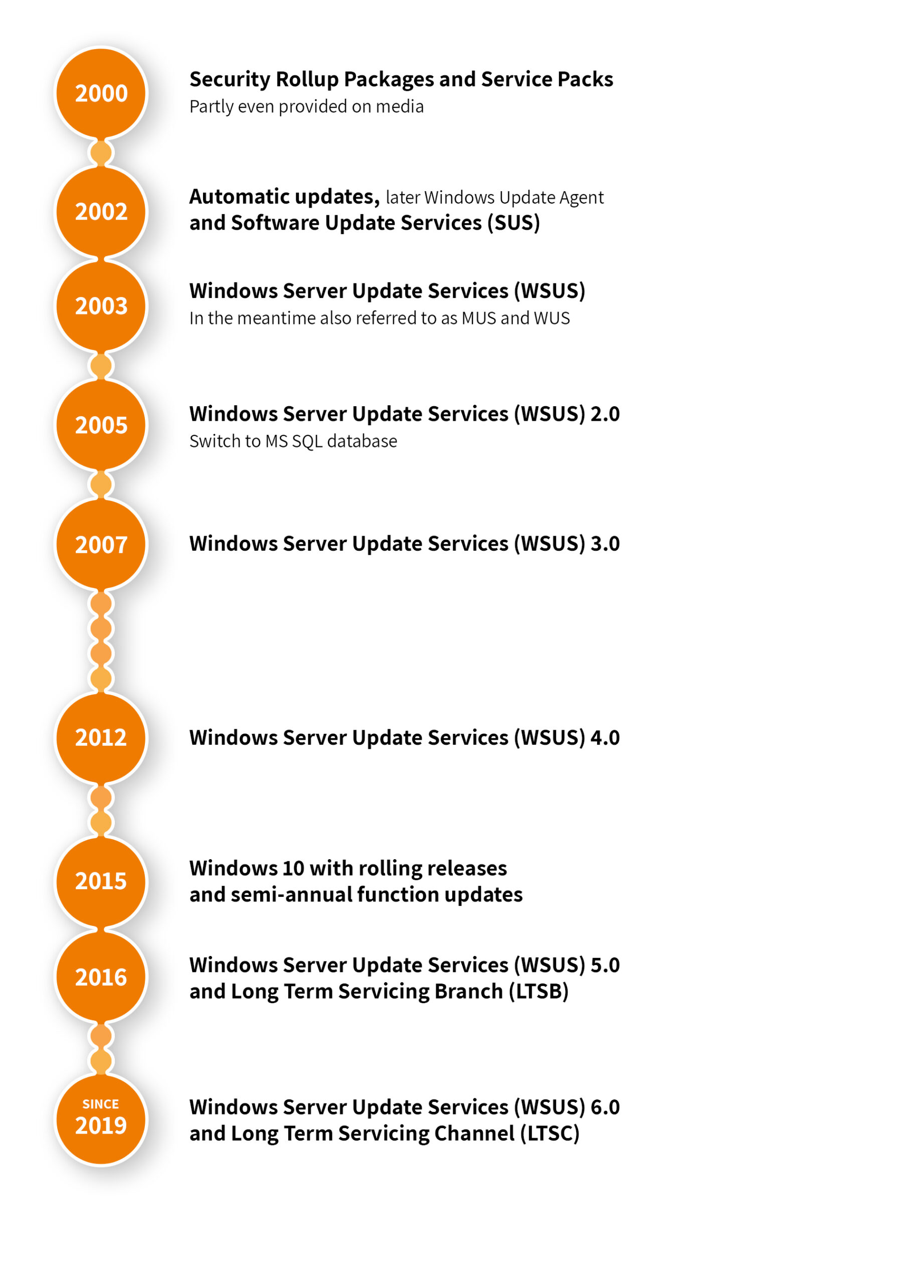Before Windows 2000 SP3, updates were organized by Microsoft in so-called Security Rollup Packages and Service Packs [1]. Thus, various bugs were fixed and new functions introduced in longer, more or less irregular intervals, which corresponded more to an extensive upgrade than a dedicated patch for a concrete problem. In the absence of widespread broadband coverage, these were sometimes even made available on media, e. g. also via magazine CDs of well-known computer magazines. With the feature of the “automatic updates” (later Windows Update Agent) Microsoft offered since 2002 a possibility to provide and install individual updates automatically in the background. Parallel with the SUS (Software Update Services) and the successor WSUS (Windows Server Update Services – in the meantime also MUS and WUS [2]), which is contained since Windows Server 2003, a service was made available to provide and release updates locally in the company. Since then, many administrators are looking forward to the second Tuesday of the month, the so-called “Patch Tuesday”, when Microsoft provides new updates. Also, Microsoft currently refers to patches that are unplanned, necessary outside of the regular rhythm and are released at short notice as out-of-band updates (OOB).