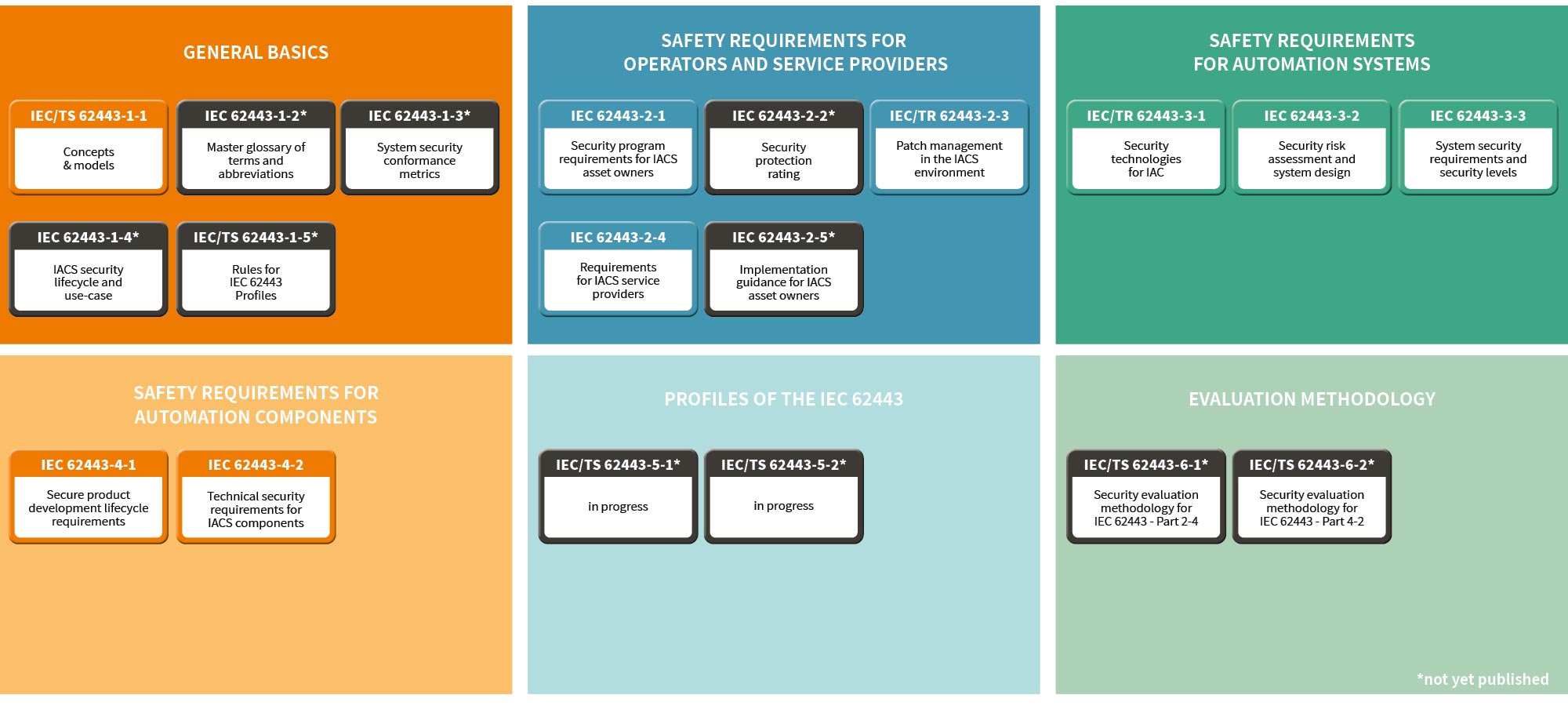 The main goal of IEC 62443 is to identify possible vulnerabilities in industrial control and communication technology and to develop adequate protective measures. Here you will find the structure of the IEC 62443 series of standards:
