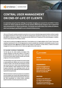 An automotive group faced the challenge of centrally managing user accounts for end-of-life OT clients as well as OT clients outside the domain. But the solutions offered by the company’s own IT department were not practical for OT clients in production. The decision was made in favor of our ondeso SR software, which was developed specifically for use in industrial infrastructures.