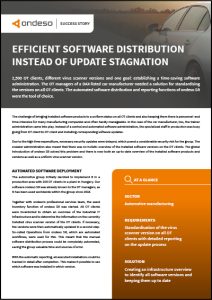 2,500 OT clients, different virus scanner versions and one goal: establishing a time-saving software administration. The OT managers of a DAX-listed car manufacturer needed a solution for standardising the versions on all OT clients. The automated software distribution and reporting functions of ondeso SR were the tool of choice.